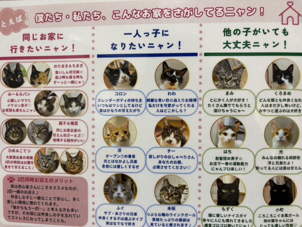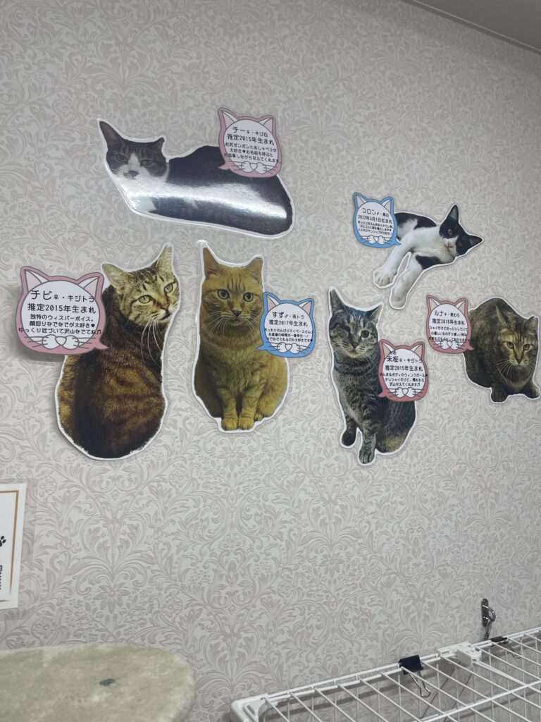触れ合いルームに猫たちのプロフィールが載っているので見てみてください。
