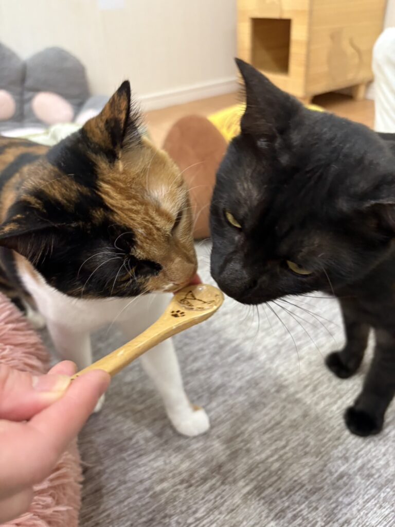 スプーンでオヤツを口元に寄せると、ニャーニャー鳴きながら集合してくれます。